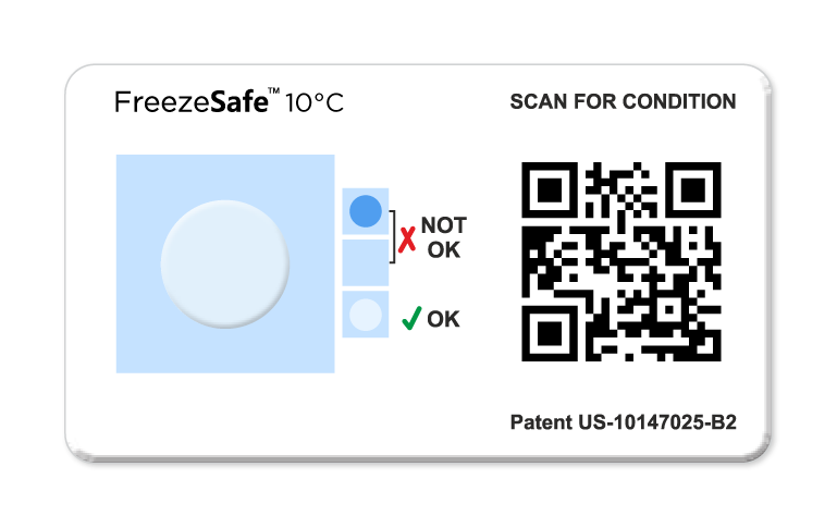 FreezeSafe QR provides irreversible evidence of below-threshold exposure, shown by a clear-to-magenta, light blue to dark blue or light grey to dark grey color change, and is designed for a simple accept or reject visual check. (FreezeSafe overview)