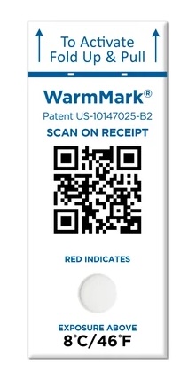 WarmMark QR is a single-use, battery-free, connected time-temperature indicator that can be read using a smartphone. When scanned, the system captures a record that may include the time and date of the scan, location data, the indicator serial number, and the condition shown at the moment of receipt.
